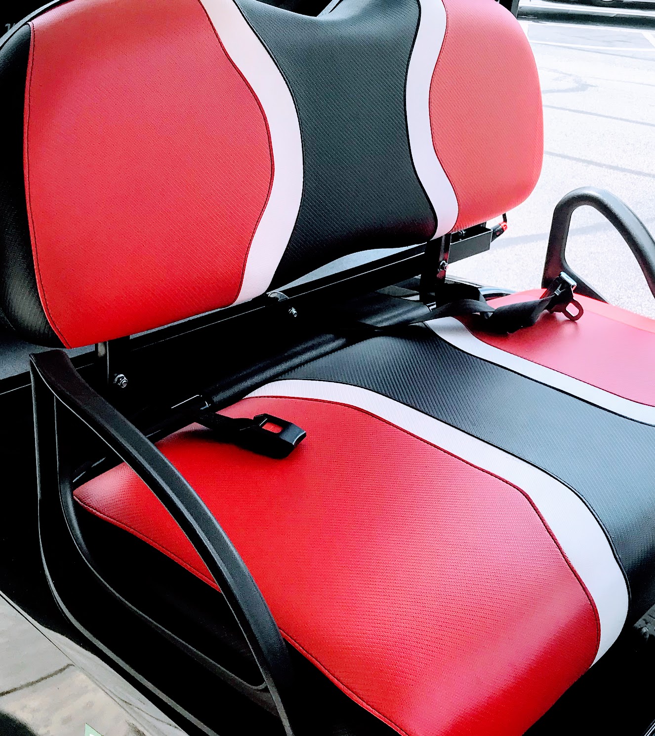 Another idea for customizing your cart is to cover your old golf cart seats with a new custom color design.